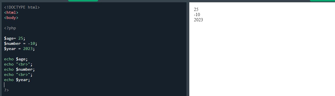 <?php $age= 25; $number = -10; $year = 2023; echo $age; echo "<br>"; echo $number; echo "<br>"; echo $year; ?>