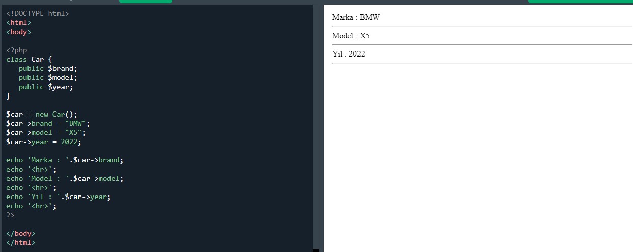 Bu örnekte, “Car” adında bir sınıf tanımlanır ve “Car” sınıfından bir nesne oluşturulur. Nesnenin özellikleri (brand, model, year) belirli değerlere atanır.